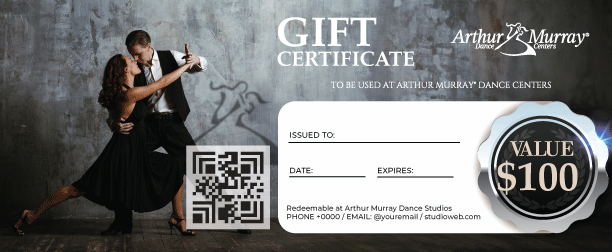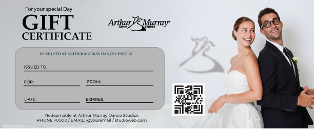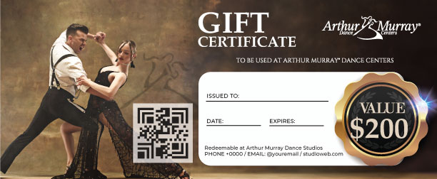 giver!...Any occasion is the perfect time to give the gift of dancing to your friends and family. Arthur Murray (Dance Studio Name) Gift Certificates are guaranteed to be voted the “Best Gift Ever.”
